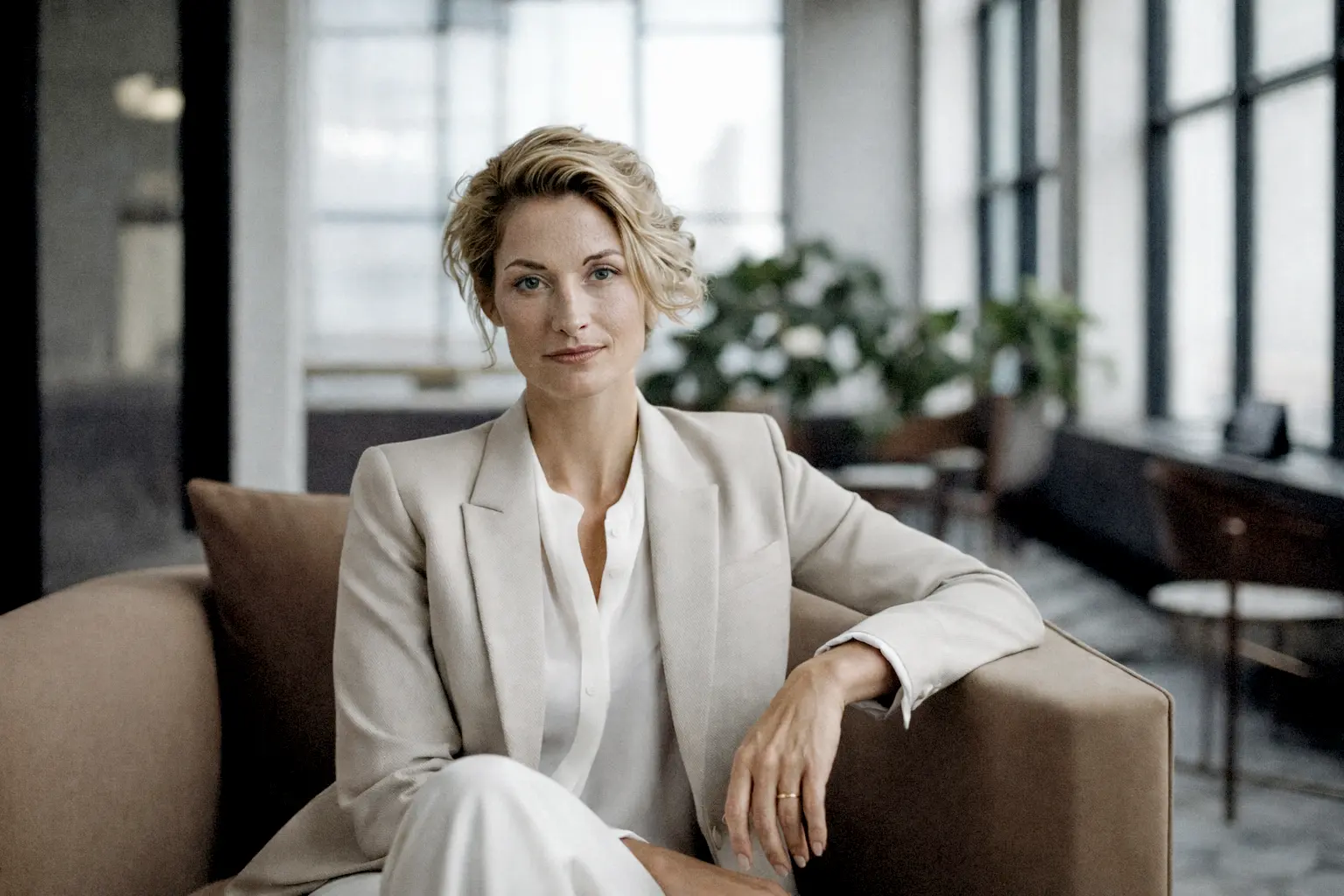 Clean, confident, and minimal. Dark or neutral grey backgrounds work well for legal and finance. Business formal or smart business casual attire. We will discuss the look that fits your firm's culture and your personal brand at the start of the session. In the City, clients in banking, law and insurance typically opt for a dark or grey background — clean and authoritative.